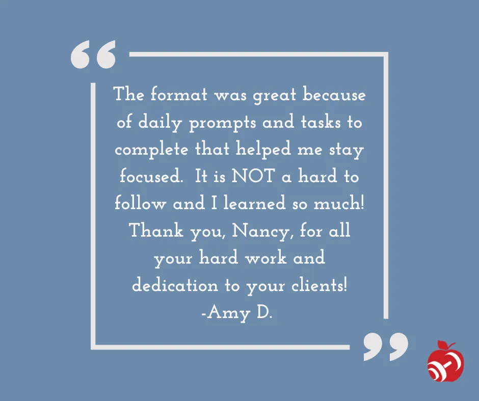 "I found Nancy’s program and did a month long challenge. I then decided to learn more through a call with Nancy. Right away we connected and I knew I could work with her and she was going to be able to relate! l learned to not yo-yo diet. Simple choices can make a difference in how you feel. I love this format. Perfect amount of time to feel doable while still getting in my walking!"
